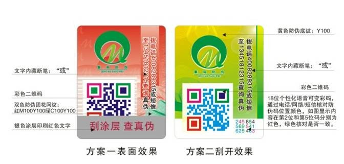 彩碼辨色防偽技術(shù)是通過(guò)公司的核心防偽技術(shù)信息化編碼/解碼,為每件產(chǎn)品生成唯一的防偽碼及具體每一位防偽碼的顏色,(具體有紅、橙、黃、綠、青、蘭、紫、黑8色,并用專(zhuān)用軟件將彩色防偽碼印制在標(biāo)貼紙上,同時(shí)將其彩色碼信息存儲(chǔ)在防偽數(shù)據(jù)庫(kù)中。通過(guò)電話、網(wǎng)絡(luò)等方式調(diào)取存儲(chǔ)的防偽碼及防偽碼的顏色信息,與其標(biāo)貼上的防偽碼顏色及防偽碼信息來(lái)比較是否一致,確定所查尋該產(chǎn)品的真?zhèn)巍?BR> 彩碼可變二維碼防偽標(biāo)簽特點(diǎn):1、多重防偽,性能可靠。其防偽信息,既有防偽碼數(shù)字信息又有每一位防偽碼的顏色信息,還有材料的特征信息,實(shí)現(xiàn)了三重防偽;2、有效地控制抄寫(xiě)防偽碼復(fù)制。造假者即使抄寫(xiě)防偽碼抄顏色復(fù)制,以菲林出片方式印制每枚標(biāo)簽最少要數(shù)百元;采取數(shù)字印刷方式,一枚標(biāo)簽也要花幾十元。成本高不劃算。3、從彩碼二維碼防偽標(biāo)簽有一個(gè)非常大的優(yōu)勢(shì),識(shí)別簡(jiǎn)便直觀,系統(tǒng)查詢完后,語(yǔ)音短信網(wǎng)絡(luò)會(huì)自動(dòng)提示該產(chǎn)品的防偽碼及顏色信息。