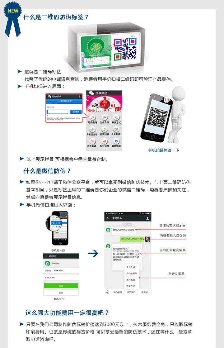 拿手機(jī)掃產(chǎn)品包裝上面的條形碼或二維碼已經(jīng)成為消費(fèi)者的一種習(xí)慣,人都是有好奇的心理,產(chǎn)品上面貼有二維碼,大多消費(fèi)者都會(huì)去掃描看個(gè)究竟。為此,我們將防偽標(biāo)簽升級(jí)到二維碼掃描查詢,在查詢產(chǎn)品真?zhèn)蔚耐瑫r(shí)把企業(yè)的品牌信息,產(chǎn)品系列信息,營銷活動(dòng)信息展現(xiàn)給消費(fèi)者。當(dāng)產(chǎn)品陳列在各大賣場時(shí)都在無形的幫你企業(yè)宣傳營銷。消費(fèi)者通過掃描標(biāo)簽更全面的了解了廠商信息,心里更加踏實(shí),買的放心!