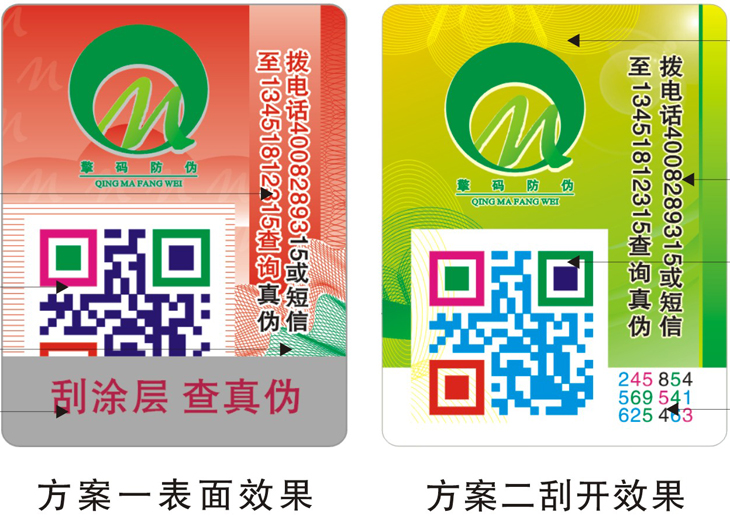 彩色二維碼防偽技術(shù)特點: 1、提高了防偽技術(shù)含量,彩色二位碼防偽標(biāo)簽是目前防偽行業(yè)比較先進(jìn)的技術(shù),全中國能實現(xiàn)這一技術(shù)的寥寥無幾,普通的印刷廠是無法印刷出可變彩色二維碼標(biāo)簽的。所以讓造假者無機(jī)可乘,望而生畏。 2、方便消費者查詢,消費者再也不用輸入那長長的產(chǎn)品防偽碼了,拿出手機(jī)一掃即可得知產(chǎn)品真?zhèn),方便快捷,受到廣大消費者的喜愛。 3、彩色二維碼標(biāo)簽不再單調(diào),更加美觀,總有客戶抱怨老的黑白二維碼標(biāo)簽不美觀,與產(chǎn)品包裝不協(xié)調(diào),彩色二維碼標(biāo)簽一出世,這一問題迎刃而解。 4、彩色二維碼標(biāo)簽讓你的產(chǎn)品脫穎而出,使得銷量大增。在我們生活中各個地方,都能看見二維碼身影,戶外廣告牌上、公交車上、車身廣告、書本上、網(wǎng)站上、產(chǎn)品包裝上等等,真可謂是無處不在。但是你會發(fā)現(xiàn)基本上都是黑白二維碼。若產(chǎn)品包裝上能出現(xiàn)彩色二維碼將引起消費者的好奇,吸引消費者的眼光,達(dá)到某種促銷的意義。