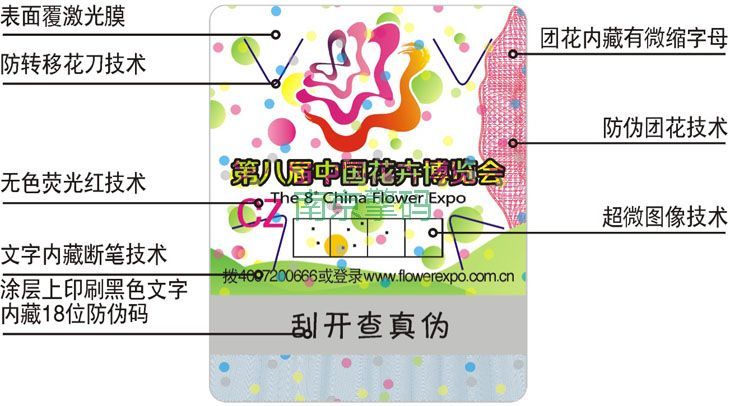 超微縮文字圖像技術(shù):通過專用算法加密,保密性好,以點陣形式表現(xiàn),可以通過數(shù)點子的個數(shù)來防偽,非常直觀,鑒別簡單。點陣位置隨機(jī),防偽性能高,難批量復(fù)制。 防偽團(tuán)花:該技術(shù)是由專用版紋軟件隨機(jī)生成,,圖像條紋變化多端,掃描復(fù)制無法得到,隨機(jī)性強(qiáng),防偽價值高。 超微技術(shù)的防偽原理是將文字高度縮小,是文字形成細(xì)細(xì)的線條,賦予變化后隱藏到版紋內(nèi),用30倍的放大鏡即可看清內(nèi)容,