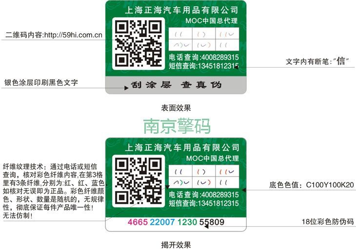 1、紋理纖維條紋具有普通數(shù)碼防偽的所有特征 2、紋理纖維防偽的顏色由系統(tǒng)加密隨機(jī)產(chǎn)生,無(wú)規(guī)律 3、方格里纖維條紋數(shù)量由系統(tǒng)加密隨機(jī)生成,無(wú)規(guī)律; 4、方格里纖維條紋在標(biāo)簽上的分布位置由系統(tǒng)加密隨機(jī)產(chǎn)生分布,無(wú)規(guī)律; 5、方格里纖維條紋長(zhǎng)度根據(jù)標(biāo)識(shí)物大小或企業(yè)需求進(jìn)行調(diào)整 6、方格里纖維條紋粗細(xì)根據(jù)標(biāo)識(shí)物大小或企業(yè)需求進(jìn)行調(diào)整 7、整體防偽效果明顯,便于商品的普通消費(fèi)者識(shí)別和辨認(rèn); 8、纖維紋理防偽與傳統(tǒng)的紙張嵌入的纖維不同,傳統(tǒng)紙張嵌入的纖維雖然具有隨機(jī)性,但它具有不可查詢性,紙張是很容易造假,無(wú)法驗(yàn)證是否正確。而紋理纖維防偽可通過(guò)查詢比對(duì)纖維條紋形狀、顏色、數(shù)量是否相同來(lái)判斷真假;消費(fèi)者就可通過(guò)電話 、網(wǎng)站、短信平臺(tái)將該圖像與載體上的隨機(jī)結(jié)構(gòu)纖維圖形進(jìn)行對(duì)照,從而辨認(rèn)真?zhèn)巍?BR>