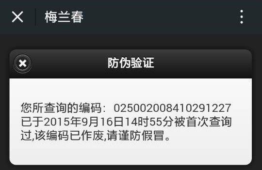 標(biāo)簽上的二維碼含有產(chǎn)品的身份編碼信息,每個(gè)產(chǎn)品的身份編碼都是唯一的,存于數(shù)據(jù)庫(kù),消費(fèi)者購(gòu)買產(chǎn)品首次掃碼查詢,系統(tǒng)自動(dòng)將二維碼含的身份信息與數(shù)據(jù)庫(kù)中比對(duì),正確無誤返回生產(chǎn)廠商。再次查詢返回已被查詢,并且顯示出首次查詢時(shí)間。
